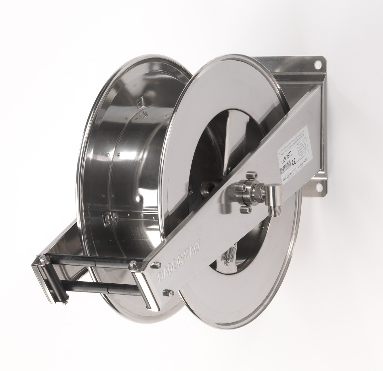Flexbimec RVS veer aangedreven slanghaspel met vaste slanguitloop.